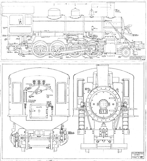 The 2-8-0 Consolidation is a freelance model of the early slide valve type. The model reflects an early 1930's update. In this period the inside valve gear was changed to outside for better efficiency and ease of maintenance. Sometimes new stacks, domes and cabs were added. Piston valve conversions were also made when updating, but we have retained the slide valve for ease of construction. Gene Allen has always felt that the slide valve was the easiest valve type for the beginner to handle. It has 5 3/8" (51" prototype) drivers. This puts it in the switcher and short-haul class. Using many of the mogul castings and boiler helps to keep the cost down. The rigid wheelbase is only one inch longer than the mogul, thus keeping the same turning radius of 32 feet. In keeping with the updated theme, the tender trucks have been changed to ball bearing instead of friction bearing arch bar type. As with the rest of our line of engines, it is very easy to kit-bash. It could be built as a small Mikado by making some frame changes and adding a trailing truck.